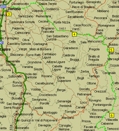 sulle statali. Lasciamo il Piemonte per la Lombardia attraversando Salice Terme, Godiasco, Ponte Nizza e Varzi [4], prima di salire sul